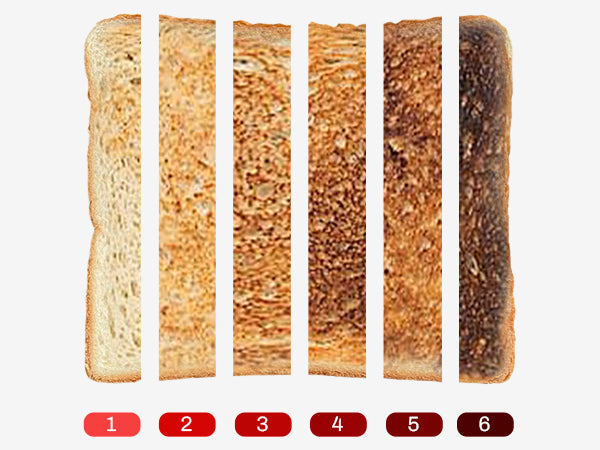 The toasters offers a full range of browning options to allow perfect customization of any piece of bread from light to dark: Settings 1-2 (70s - 100s): Light toast shade