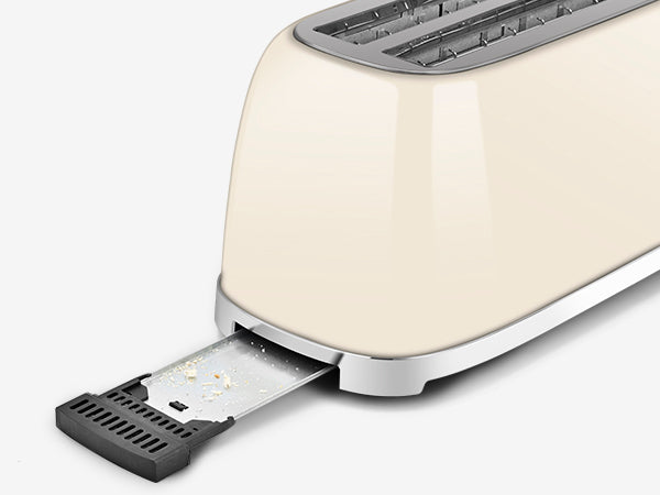 The slide-out crumb tray located behind the toaster can be effortlessly removed for cleaning.